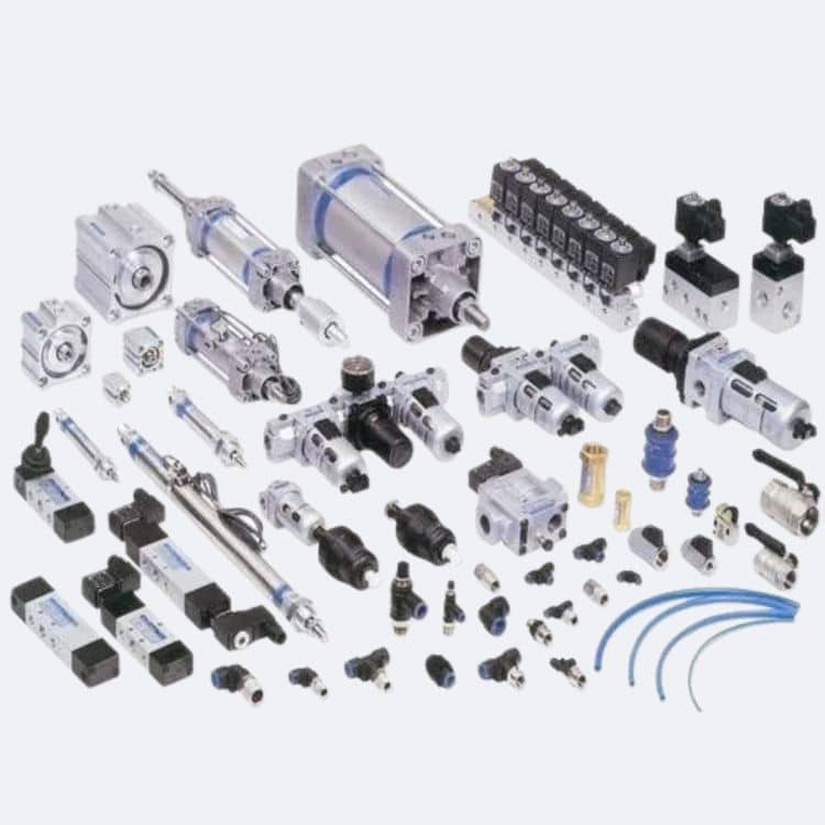 Components: Solenoid valves, rotary valves, cylinders, air regulators, moisture separators, silencers, auto drain valves, fittings, FRLs, copper pipes